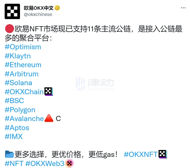 BlockBeats 消息,1 月 20 日,據官方消息,歐易 NFT 市場已正式接入 Optimism 和 Klaytn。此外,歐易 NFT 市場已完成 Opensea 所有 EVM 網絡掛單的拉取,包括 BSC、Arbitrum、Avalanche、Optimism、Klaytn 的所有合集掛單。據悉,歐易 NFT 市場是支持公鏈數量最多的 NFT 交易聚合平臺,此前已支持 Ethereum、Solana、OKC、BSC、Polygon、Avalanche C、IMX、Arbitrum 以及 Aptos。目前共支持 11 條主流公鏈。