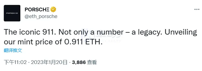 BlockBeats 消息,1 月 20 日,據官方消息,保時捷 NFT 鑄造價格為每枚 0.911 ETH。BlockBeats 此前報道,保時捷 NFT 項目方公布的鑄造日期為 1 月 23 日。