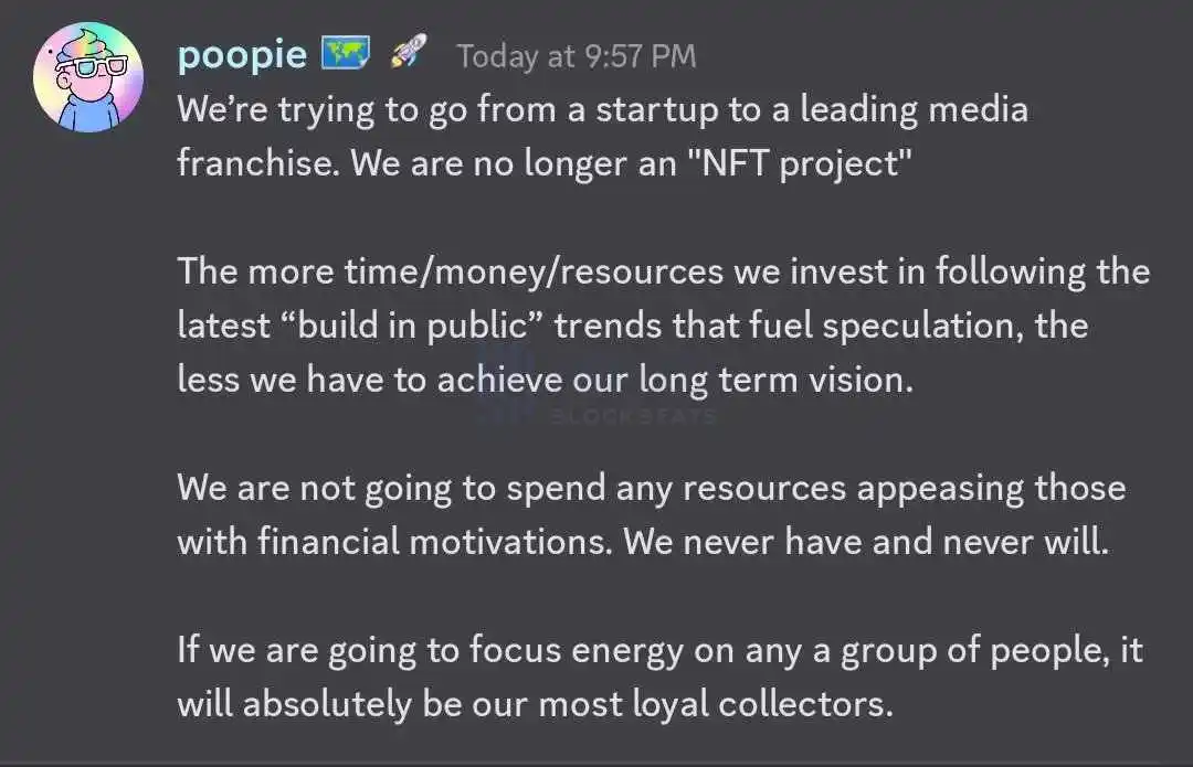 BlockBeats 消息,3 月 15 日,NFT 系列 Doodles 創始人 Jordan Castro 在官方 Discord 宣布,Doodles 將從一個「NFT 項目」發展成一家領先的媒體特許經營公司。Castro 表示:在刺激投機的「公開建設」上投入得越多,就越不能實現其長期願景。不會花任何資源去安撫那些有經濟動機的人,將把精力集中在忠實持有人身上。