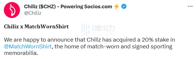 Chiliz:已收購紀念品平臺MatchWornShirt(MWS)20%股份