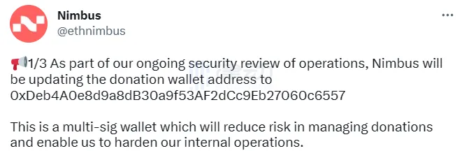 BlockBeats 消息,3 月 16 日,以太坊客戶端 Nimbus 宣布將捐贈錢包地址更新為 0xDeb4A0e8d9a8dB30a9f53AF2dCc9Eb27060c6557,Nimbus 稱該地址是一個多重簽名錢包地址,將降低管理捐贈風險並加強內部運營。原始捐贈地址的資金將在接下來的 24 小時內轉移到這個新的地址中。Nimbus 在 Gitcoin 上的捐贈地址將在未來幾天更新為這個新的地址。Nimbus 保留對原始捐贈地址中資金的訪問權限。