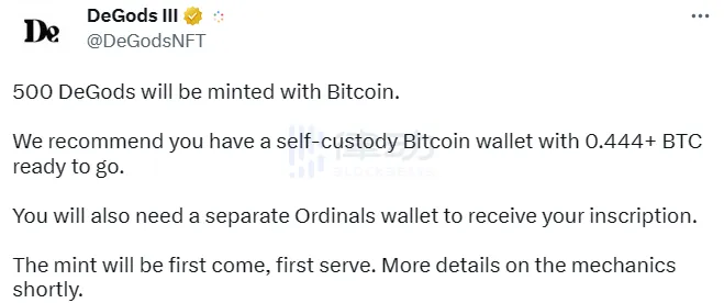 BlockBeats 消息,3 月 16 日,NFT 項目 DeGods 宣布,將於比特幣網絡開放 500 枚新系列 NFT 鑄造,每枚 NFT 鑄造價格為 0.444 枚 BTC,先到先得。暫定的鑄造時間為太平洋標準時間周五下午,更多信息將稍後發布。