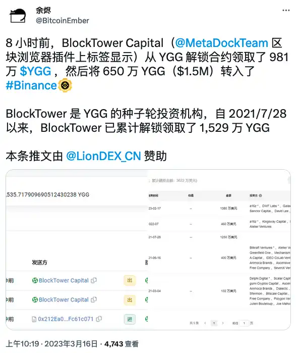 BlockBeats 消息,3 月 16 日,據鏈上數據分析師余燼監測,被標記為 BlockTower Capital 地址從 YGG 解鎖合約領取了 981 萬枚 YGG,然後將 650 萬枚 YGG(價值約 150 萬美元)轉入了 Binance。BlockTower 是 YGG 的種子輪投資機構,自 2021 年 7 月 28 日 以來,BlockTower 已累計解鎖領取了 1529 萬枚 YGG,其中 100 萬枚通過 Uniswap 出售,1098 萬枚轉入了 Binance。