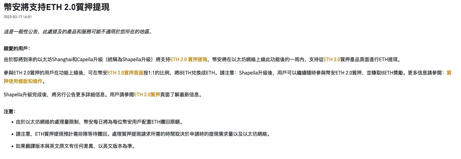 BlockBeats 消息,3 月 17 日,Binance 發布公告稱,由於即將到來的以太坊 Shanghai 和 Capella 升級(統稱為 Shapella 升級)將支持 ETH 2.0 質押提現,Binance 將在以太坊網絡上線此功能後的一周內,支持從 ETH 2.0 質押產品頁面進行 ETH 提現。參與 ETH 2.0 質押的用戶在功能上線後,可在 BinanceETH 2.0 質押頁面按 1:1 的比例,將 BETH 兌換成 ETH。Shapella 升級後,用戶也可以繼續隨時參與 BinanceETH 2.0 質押,並賺取 BETH 獎勵。