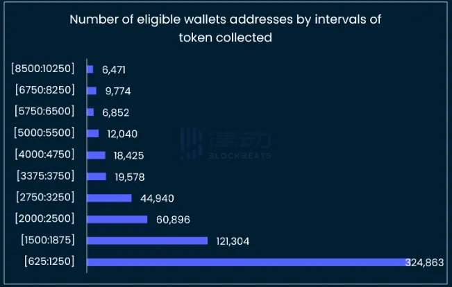 BlockBeats 消息,3 月 17 日,據 Nansen 數據,截至 2 月 6 日 Arbitrum 空投快照,共有約 230 萬地址有 Arbitrum One 跨鏈記錄,最終有 625,143 個地址獲取了空投資格,占比約為 28%。此外,獲得最高空投額度(8500-10,250)的地址數為 6471 個,占合格空投地址數的 1.03%。獲得最低空投額度(625-1250)的地址數為 324,863 個,占合格空投地址數的 51.96%。