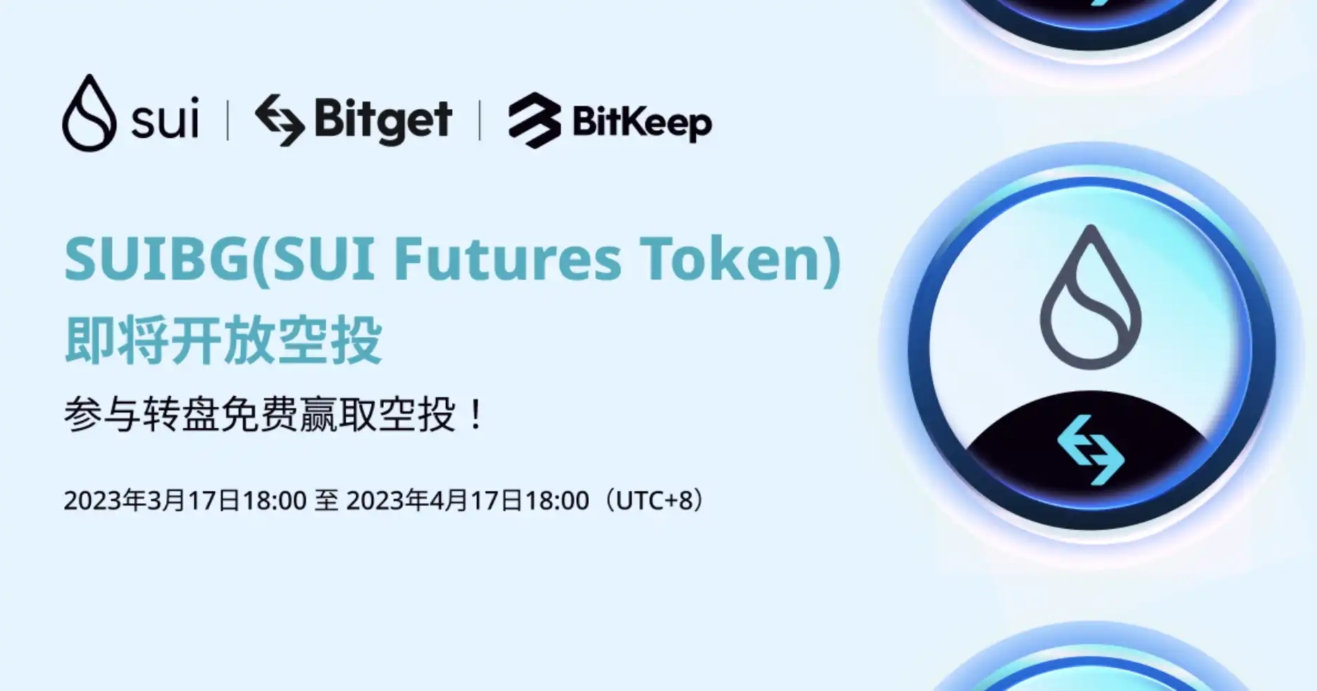 BlockBeats 消息,3 月 17 日,Bitget 表示,為進一步支持 Layer 1 公鏈創新 和 SUI 生態發展,現推出 SUI Futures Token (簡稱 SUIBG) 空投抽獎活動。用戶完成相應任務即可獲得 SUIBG,未來可按照比例獲得兌換 SUI 官方 Token 的資格。活動時間為 2023 年 3 月 17 日 18:00 至 2023 年 4 月 17 日 18:00(UTC+8)。