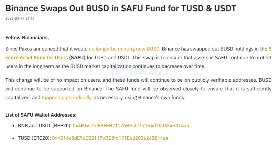 BlockBeats 消息,3 月 17 日,Binance 公告稱,已將用戶安全資產基金(SAFU)中持有的 BUSD 兌換成 TUSD 與 USDT,以確保 SAFU 中的資產在 BUSD 市場持續下降的情況下長期保護用戶。Binance 表示,SAFU 基金將受到密切關註,以確保其資本充足,並在必要時使用 Binance 自有資金定期補充資金。