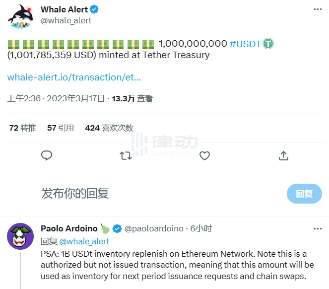 BlockBeats 消息,3 月 17 日,據 Whale Alert 數據顯示,穩定幣發行商 Tether 於北京時間 3 月 17 日 2:35:59 在以太坊網絡增發 10 億枚 USDT。Tether 首席技術官 Paolo Ardoino 補充表示,這是一筆在以太坊網絡已授權但未發行的交易,意味著本次增發將用於下一次發行請求和鏈上交互。
