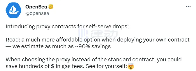 BlockBeats 消息,3 月 17 日,NFT 市場 OpenSea 宣布引入自助 Drop(Self-serve Drops)代理合約,創作者可以使用新代理合約或標準合約創建藝術品系列。OpenSea 表示,自助 Drop 代理合約預計可節省 90% 的 Gas 費用。