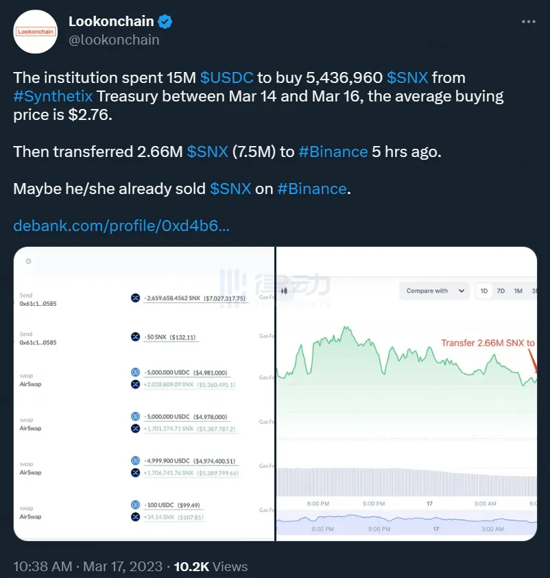 BlockBeats 消息,3 月 17 日,據 Lookonchain 監測數據顯示,曾於 3 月 14 日至 3 月 16 日以 1500 萬美元從 Synthetix 財庫購入約 543.7 萬枚 SNX 的某機構巨鯨地址,在 5 小時前將 266 萬枚 SNX(約合 750 萬美元) 轉入 Binance。
