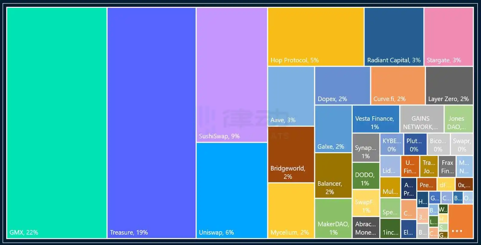 數據:Arbitrum生態總交易和合約日誌份額占比GMX排名第一