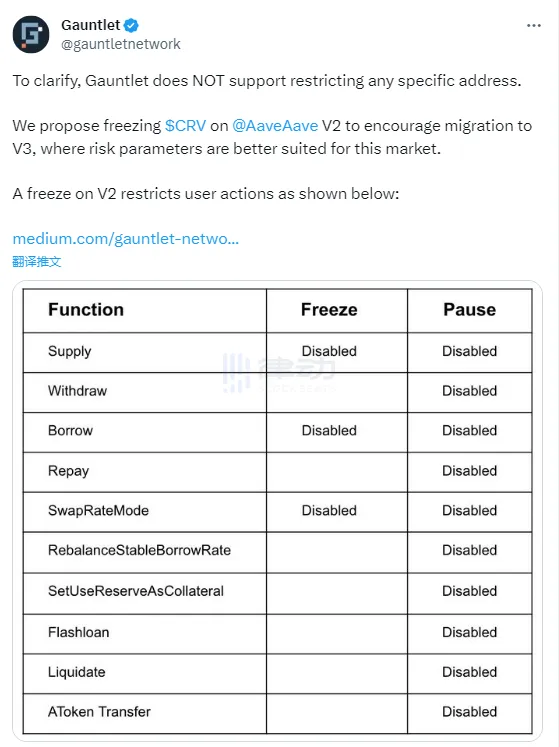 BlockBeats 消息,6 月 15 日,DeFi 風險管理器 Gauntlet 建議在 Aave v2 上凍結 CRV,旨在大幅降低損失風險。鼓勵用戶遷移至 Aave v3,Gauntlet 表示 v3 的風險參數更適合 CRV 借貸市場。其中凍結 v2 的 CRV 市場會限製用戶操作,包括存入、借出等操作。