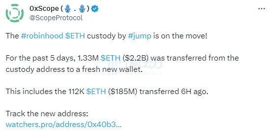 BlockBeats 消息,6 月 15 日,據 0xScope 監測,在過去 5 天內,共有 133 萬枚 ETH(約 22 億美元)從加密做市商 Jump Trading 負責的 Robinhood 平臺托管地址轉移到一個全新地址中,包括 6 小時前轉出的 11.2 萬枚 ETH(1.85 億美元)。
