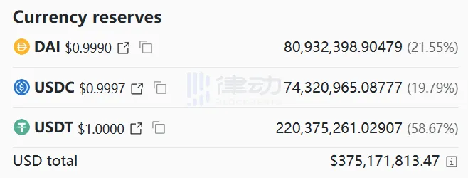 BlockBeats 消息,6 月 15 日,據 Curve 官方數據顯示,當前 3pool 中 USDT 占比已達 58.67%(220,375,261 枚),而 DAI 和 USDC 的占比分別為 21.55%(80,932,398 枚)和 19.79%(74,320,965 枚)。