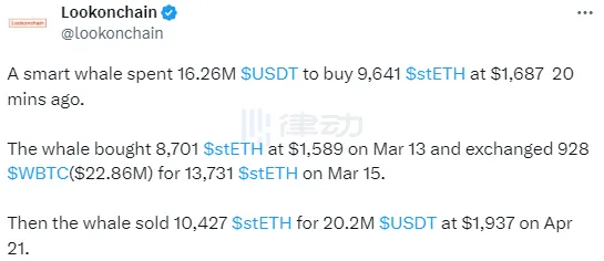 Lookonchain:某巨鯨以1626萬枚USDT買入9641枚stETH