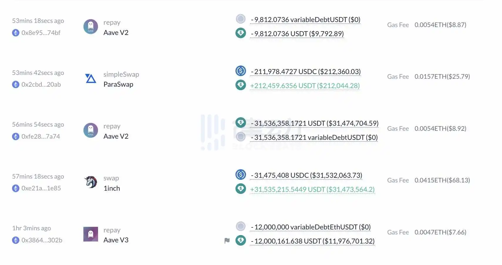 BlockBeats 消息,6 月 15 日,據 Lookonchain 監測,巨鯨地址 czsamsun.eth 停止做空 USDT,已將 USDC 兌換成 USDT 償還在 Aave V2 上的借貸。此前該地址在 USDT 出現脫錨後使用 Aave V2 做空 USDT,他從 Aave V2 借出 31,544,278 枚 USDT,並以 0.9978 美元的匯率兌換 31,475,408 枚 USDC。