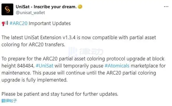 UniSat:將暫停Atomicals市場,直至ARC20部分染色升級完全實施