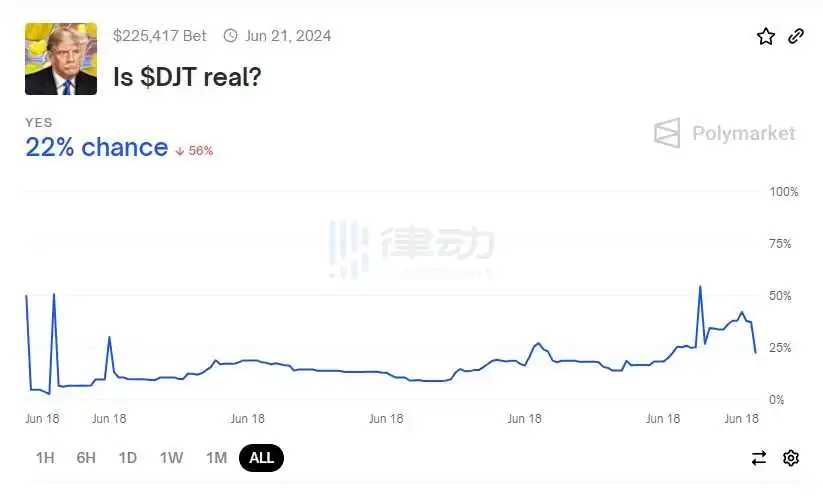 Polymarket上預測DJT「與特朗普有直接關聯」的概率現報22%