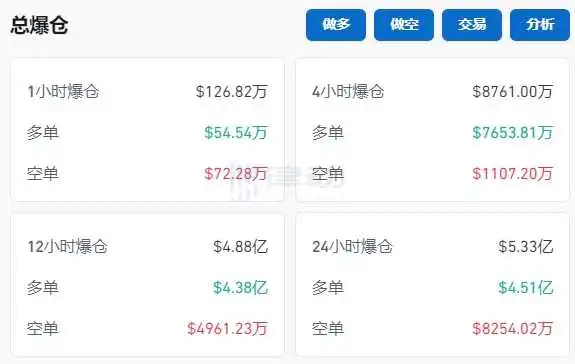 過去24小時全網爆倉5.33億美元,爆倉人數超15.4萬