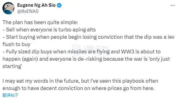 BlockBeats 消息,10 月 2 日,頂級交易員 Eugene 今日淩晨發文闡述其接下來的投資策略:當每個人都在快速模仿其他玩家時出售;當人們開始不再相信下跌是一次買入機會時,開始買入;當導彈四處飛舞、第三次世界大戰即將再次爆發,而每個人都在降低風險,因為戰爭「才剛剛開始」時,大規模逢低買入。最後,Eugene 補充表示,「我將來可能會食言,但我已經多次看到這種劇本,因此對價格今後的走向有相當的把握。」