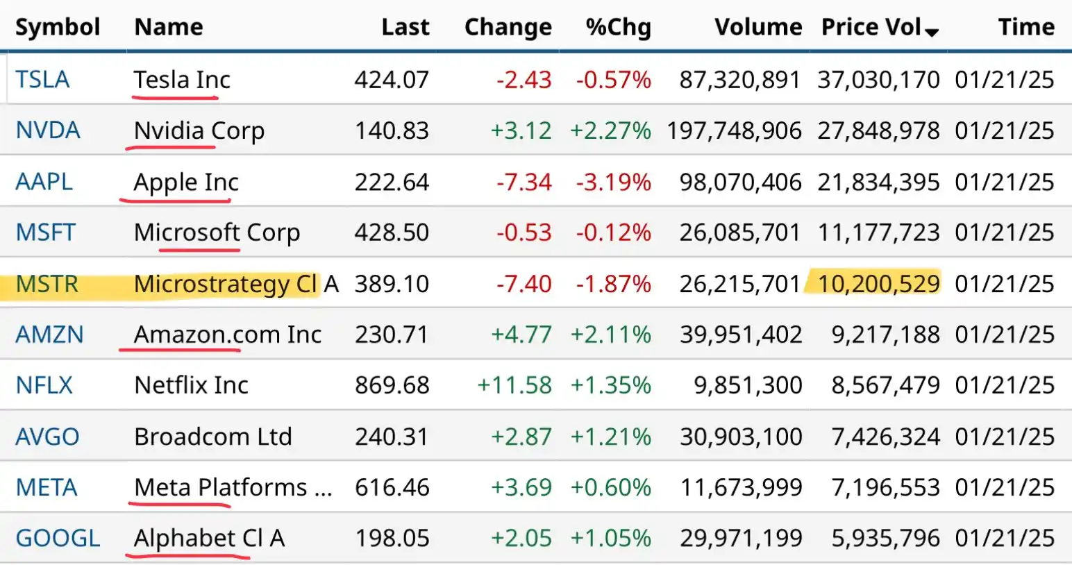 MSTR今日交易量突破100億美元,與「美股七姐妹」齊頭並進