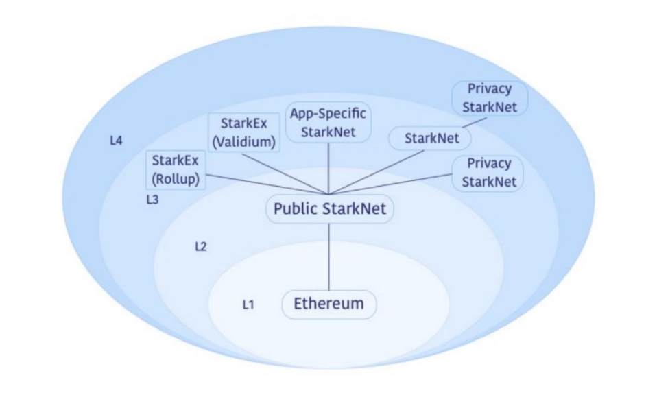 4、隱私 StarkNet 實例(在此示例中也作為 L4)允許隱私保護類型的交易存在,而不將它們包含在公共 StarkNet 中。