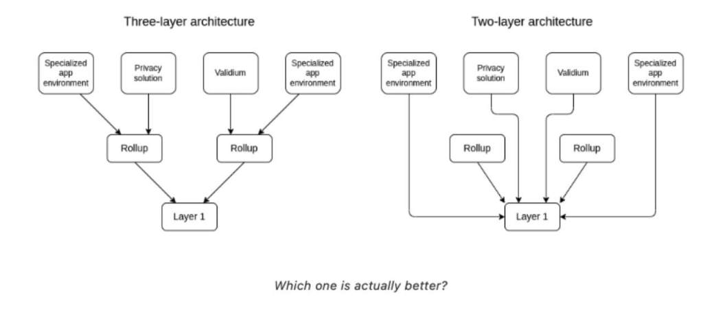 由在其自身之上堆叠相同的縮放方案組成的三層縮放架構通常不能很好地工作。 在 rollups 之上的 rollups(其中兩層 rollups 使用相同的技術)的形式也不盡人意。 但是,L2 和 L3 具有不同目的的三層架構可以行得通。 rollups 之上的 Validiums 確實有意義,即使它們不能確定是長期的最佳做事方式。
