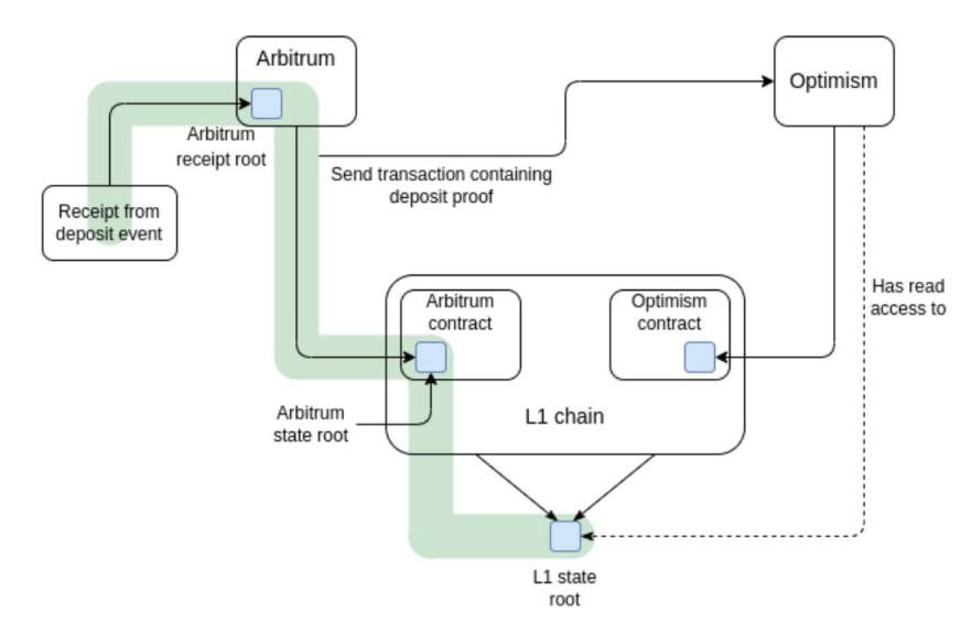 一旦 Arbitrum 最終確定,您可以獲取該收據的 Merkle 證明並植根於 L1 狀態,然後將其發送到 Optimism 上的包裝代幣合約中,該合約對其進行驗證並向您發放一個包裝代幣。