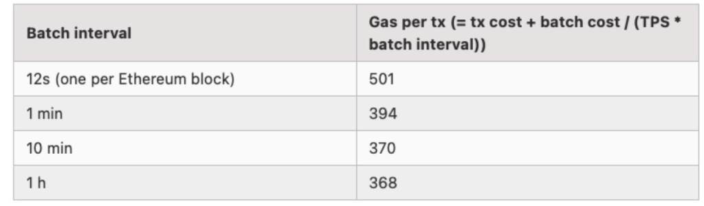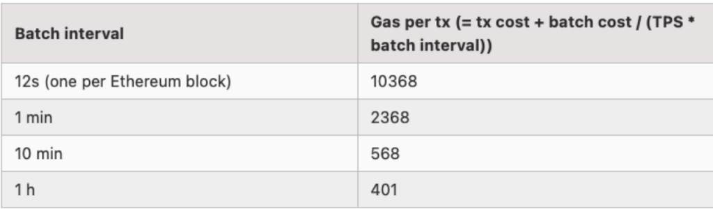 每個事務的 rollups 成本很便宜:它只是 16-60 字節的數據,具體取決於應用程序。但是 rollups 每次提交一批交易到鏈上時也必須支付高昂的固定成本: