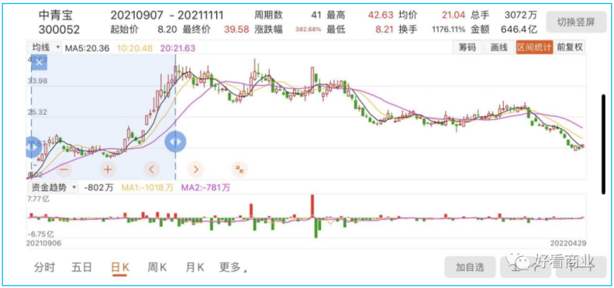 在元宇宙概念加持下,中青寶的股價在 2021 年 9 月 7 日啟動上漲,當天盤中漲停,之後勢如破竹。至 11 月 11 日,最高價達 42.63 元 / 股,市值破 100 億元。