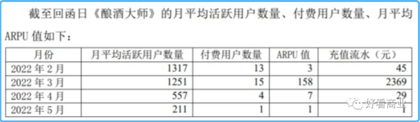 2022 年 5 月 19 日,中青寶在回復深交所的詢問函時終於自揭「馬甲」:自 2 月 28《釀酒大師》H5 版本開啟對外測試,截至回函日,近 3 個月內總充值流水僅為 2444 元。