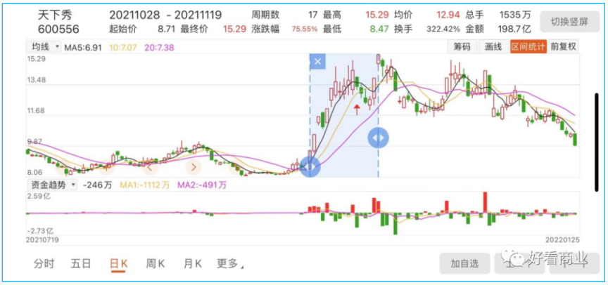 受此帶動,天下秀股價隨即連續兩個交易日漲停。10 月 28 日至 11 月 19 日,天下秀在 17 個交易日實現 7 漲停,股價接近翻倍,觸及 15.29 元高點。