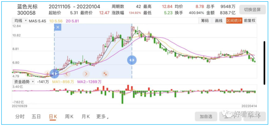 藍色光標的股價曾在 2021 年 10 月 28 日觸及全年最低點 4.83 元。進入 11 月份,其股價卻一改過去的低迷狀態,開始高歌猛進。到 2022 年 1 月 4 日,短短 2 月時間,其股價最高達到 12.84 元。而這波暴漲背後,也與不斷釋放的元宇宙消息密切關聯。