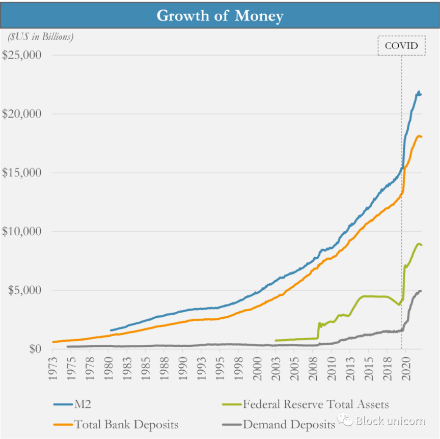 可消費現實世界貨幣的空前擴張是美聯儲的一項政策選擇,這得益於疫情期間 4.8 萬億美元的量化寬松政策。雖然這些政策決定是在一個獨特的和最初的通貨緊縮的經濟背景下刺激需求,但它並非沒有後果。簡單地說,人們現在可以支配的美元比以往任何時候都多。