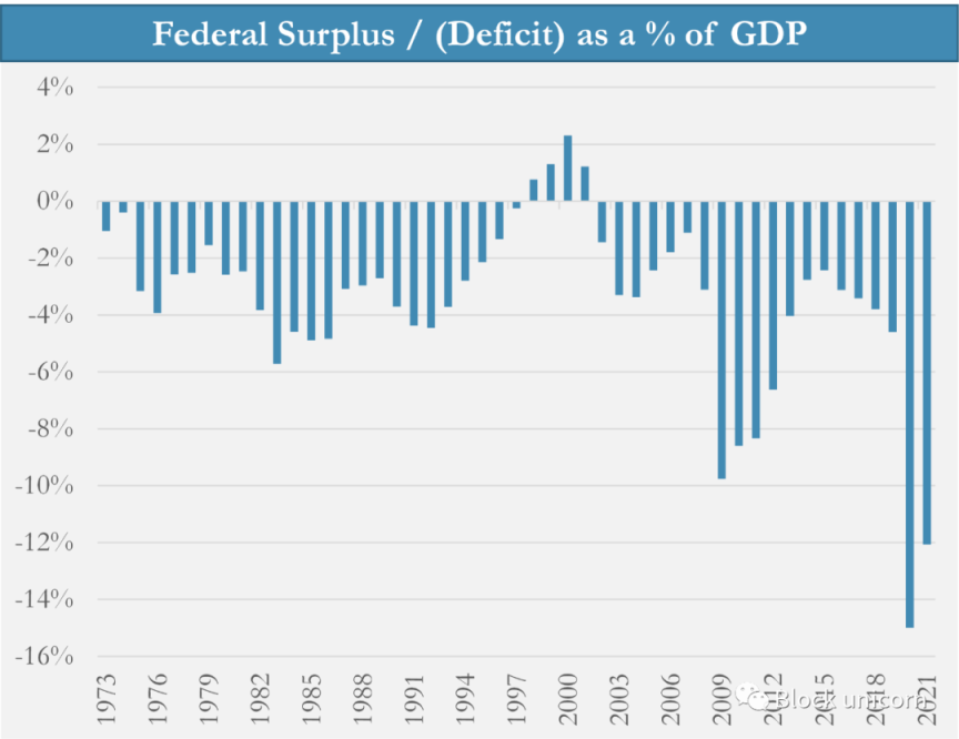 但赤字支出和財政刺激並不是一個新現象。自 1974 年以來,美國聯邦政府除了 1998 -2001 年,每年都出現赤字。過去 40 年裏,寬松的貨幣政策沒有導致通貨膨脹的論點,同樣適用於赤字支出。