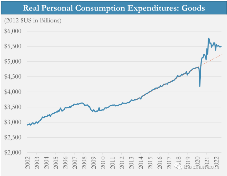 這一觀點並沒有得到數據的支持。盡管 COVID 帶來了物流方面的挑戰,但供應鏈生產(和美國消費)的商品比以往任何時候都多。從實際情況看,該國消費的商品仍然遠遠多於大流行前的趨勢。