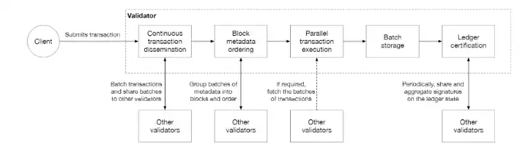 在交易發送的過程中,驗證者將把交易分組為批次,並在達成共識後合並進區塊。執行、存儲和賬本認證都是批量處理的,這種操作可以優化排序體系,減少操作步驟和並行執行。