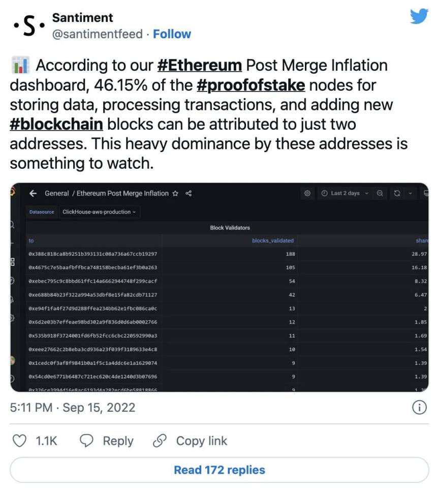 Santiment 數據顯示,在合並後,2 個地址控製了超過 45% 的以太坊交易。